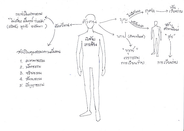 รู้ไหมเป็นอะไร คุณธรรมไม่มีชอบทำแต่บุญ คุณธรรมความเป็นคนไม่สร้าง ชอบทำแต่บุญ ตายไปเป็นสุนัข เป็นแมวมีคนเลี้ยงมีคนอาบน้ำให้ ฉะนั้นอย่าทำแค่บุญ ถ้าคุณธรรมความเป็นคนยังบกพร่อง บุญจะทำให้เราก่อเกิดเป็นตัวตนที่ไม่ได้เป็นคน แต่เป็นอะไรไม่รู้ แล้วแต่ศิษย์สร้าง ใช่หรือไม่ (ใช่)  ฉะนั้น บาป เกิดเป็นคนต้องมีดีบ้างไม่ดีบ้างเป็นธรรมดาใช่ไหม (ใช่)  ไหนมีใครไม่ทำบาปบ้างยกมือขึ้น ทุกคนเลยหรือ น่ากลัวจริงๆ เลยนักเรียนชั้นนี้ อาจารย์ถามหน่อยนะ ศิษย์ของอาจารย์โดยส่วนใหญ่ไม่กลัวบาป แต่กลัวเคราะห์กรรมถูกไหม (ถูก)  ฉะนั้นบาปมาจากกิเลส กิเลสถึงที่สุดให้ผลเป็นทุกข์ กรรมและการเวียนว่าย บุญก็เหมือนกัน ถึงแม้จะให้สุข แต่สุขนี้เมื่อเสวยเต็มที่ ก็ยังหนีไม่พ้นการเวียนว่ายถูกไหม (ถูก)  ฉะนั้นถ้าอยากทำบุญแล้วหนีพ้นการเวียนว่าย จงทำบุญนั้นด้วยการไม่มีตัวตนรองรับ บุญที่ประเสริฐที่สุดคือ บุญที่สละความเป็นตัวตนได้ บุญที่ทำแล้วให้ได้แม้กระทั่งตัวตน